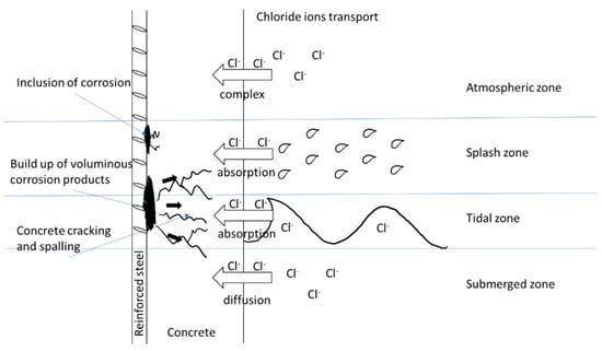 The appearance of chloride ions is a major issue in marine environments and has a very negative effect on RCC structures [11,12]. The possible transmission mechanism of chloride ions into concrete is dependent on the zone where the element is, i.e., the tidal, splash, submerged, and atmospheric zones [13]. The transport of chloride ions in concrete is mainly due to diffusion or the absorption mechanism [14]. The diffusion mechanism that occurs in the submerged zone is due to the saturation of the concrete. However, the absorption mechanism takes place in the tidal and splash zones. This allows the transport of chloride ions into RCC structures. However, the ingress of chloride ions in the atmospheric zone is quite complex when compared to the other zones [15]. This is because of factors associated with the zone, such as the direction and speed of the wind, the salinity level of the water reservoir, and the distance between the sea and the RCC structures. This study focuses on three zones, and omits the atmospheric zone due to its previously described limitations.