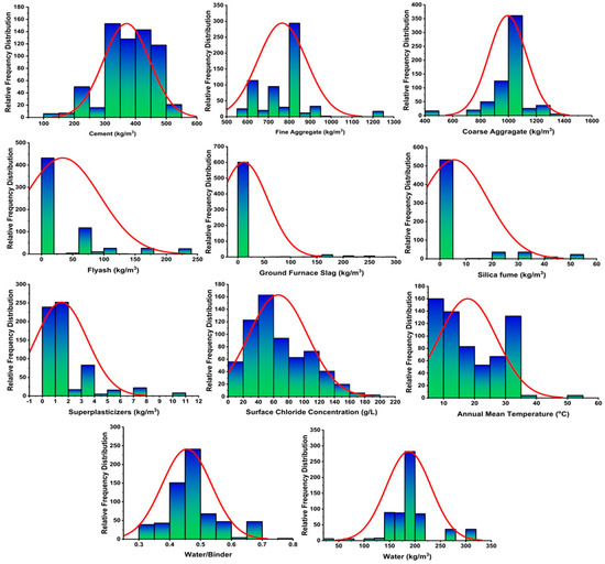 The data used to model the prediction of the surface chloride concentration are taken from published literature. These data were taken from articles describing the surface chloride concentrations in the tidal zone [48,49,50,51,52,53,54,55,56,57,58,59,60,61,62], splash zone [49,50,54,55,60,63,64] and submerged zone [54,56,60,65,66,67,68]. The data consist of 12 inputs (cement, fine and coarse aggregate, silica fume, fly ash, blast furnace slag, superplasticizer, water, exposure time, annual mean temperature, chloride content, and exposure time) and one output (surface chloride concentration). Jupitar python was used to describe the distribution of each input parameter that was applied in the prediction model and is presented in Figure 3. It is well stated that the performance of a model is significantly affected by its variables [69]. The data variables that were used for modeling, with their ranges, are listed in Table 2 and Table 3.
