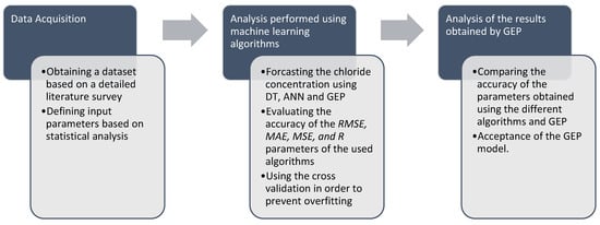 This section describes the algorithms used when modeling the prediction of surface chloride concentrations in the concrete elements of marine structures. The prediction of Cs was made using ANN, DT and GEP. A detailed flowchart of the used methodology is presented in Figure 4.