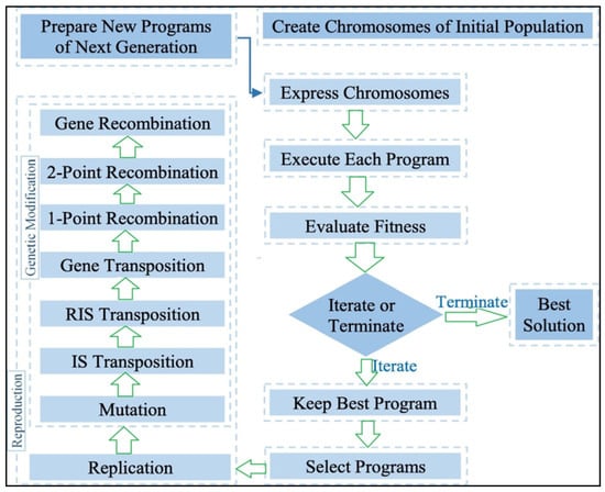 GEP is a transformative algorithm that designs computer-based programs and models. These programs usually have a tree structure that is capable of modifying its size (size, shape and arrangement), like in the case of chromosomes. For this reason, GEP, being a genotype–phenotypic system, can be much more effective when compared to adaptive techniques. The programming language of GEP is known as Karva language and is the same as the LISP languages. The stages of GEP are shown in Figure 6. GEP has many advantages over other classical regression techniques, as, in other methods, some functions are initially defined and then analyzed. However, in GEP, no predefined function is taken into consideration.