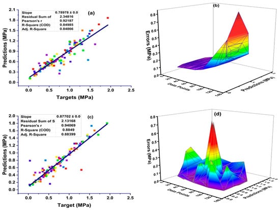 The prediction of surface chloride concentration by employing the GEP algorithm yields a strong relationship between the targeted and output values of chloride concentrations, as shown in Figure 7c. It is also clear that this model gives a better response with less variance. GEP with an R2 value of 0.88 had a better accuracy when compared to the ANN (R2 equal to 0.84) and DT (R2 equal to 0.72), as depicted in Figure 7. In turn, Figure 7d indicates the error distribution of the linear regression model. It can be seen that 72.86 percent of the data showed an error between 0.01 MPa and 0.10 MPa, and that the average error of the training set was equal to 0.080 MPa. Moreover, the maximum and minimum errors were equal to 0.76 MPa and 0.004 MPa.