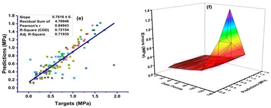 The influence of variables on the prediction of surface chloride concentrations using linear regression is illustrated in Figure 7e. The algorithm yields a decreased or poor correlation when predicting targets, which is indicated by the value of R2 being equal to 0.72, as shown in Figure 7e. In addition, Figure 7f presents the error distribution of the linear regression model and shows an average value of error equal to 0.12 MPa, with a maximum error value of 1.36 MPa. In turn, 82.1 percent of the model has an error between 0.005 MPa and 0.25 MPa.