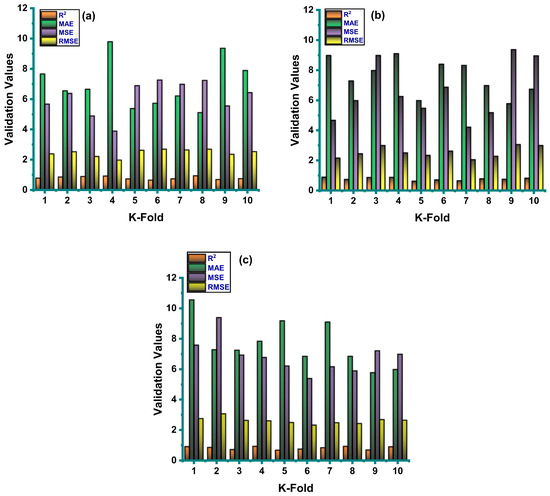 Correlation coefficient (R2), mean absolute error (MAE), mean square error (MSE), and root mean square error (RMSE) were all used to evaluate the result of cross-validation, as can be seen in Figure 8. A comparison of all three individual model techniques indicated fluctuation in their outputs. The GEP model showed fewer errors with a much better R2 value when compared to the ANN and DT. The average R2 value of GEP modeling was equal to 0.79, with maximum and minimum values being 0.94 and 0.65, as illustrated in Figure 8a. The average value of R2 for the ANN model was equal to 0.71, with the maximum and minimum values being 0.89 and 0.62. Similarly, the DT model gave an average R2 value of 0.82, with maximum and minimum values being 0.93 and 0.68, as illustrated in Figure 8b,c. The values of the errors of all the models were relatively low in the case of the validation process. For GEP, they were: MAE = 7.03 MPa, MSE = 6.12 MPa, and RMSE = 2.46 MPa (Figure 8a). In the case of the ANN, they were: MAE = 7.56 MPa, MSE = 6.60 MPa, and RMSE = 2.54 MPa (Figure 8b); and in the case of the decision tree, they were: MAE = 7.66 MPa, MSE = 6.85 MPa, and RMSE = 2.61 MPa (Figure 8c). Moreover, the K-fold cross validation of all the applied models and statistical checks are listed in Table 4 and Table 5, respectively.