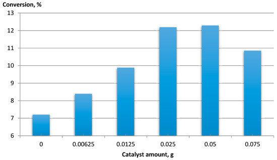 An increase in the conversion of the raw material was observed with an increase in the amount of catalyst to 0.025 g, while above 0.05 g, the conversion decreased. An increase in raw material conversion was observed with the increase in the amount of catalyst to 0.025 g. The conversion decreased above 0.05 g. This was due to the formation of a dense suspension, which made mixing difficult and thus limited the contact of oxygen with the reactants.