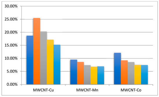 In order to test the stability and the possibility of catalyst recycling, five consecutive reaction cycles were carried out with previously prepared nanotubes (MWCNT-COO-Co, MWCNT-COO-Mn, and MWCNT-COO-Cu). The reactions were conducted as described in Section 4.3. In order to reduce the inaccuracy due to the small scale, the ethylbenzene levels were increased to 10 mL (80 mmol). Samples were taken each time for iodometric and chromatographic analysis. The solution was then filtered, and the resulting precipitate was washed with 10 mL of ethanol and dried at 90 °C. The precipitate was then used in the next reaction. Initially, 0.125 g of MWCNT modified with the corresponding salts was used.