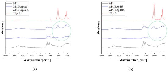FT-IR spectra of composites with different Hap contents indicated by a green circle: (a) WPI/HAp A; (b) WPI/HAp B.