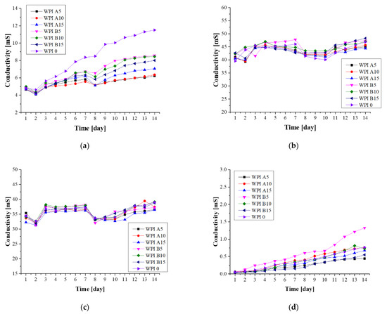 Conductivity analysis of hydrogels during a 14-day incubation in fluids simulating the biological environment: (a) incubation in artificial saliva; (b) incubation in SBF; (c) incubation in Ringer’s fluid; (d) incubation in distilled water.