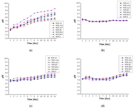 Potentiometry analysis of the hydrogels during a 14-day incubation in fluids simulating the biological environment: (a) incubation in artificial saliva; (b) incubation in SBF; (c) incubation in Ringer’s fluid; (d) incubation in distilled water.