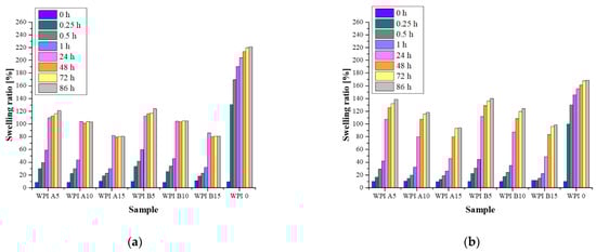 The swelling capacity was determined for unmodified WPI hydrogel and for those with added hydroxyapatites A and B (Figure 5). As a result, the swelling effect of the hydrogel materials was confirmed for all of the tested samples. The analysis was performed in four fluids: artificial saliva, SBF, Ringer’s fluid and distilled water. It was observed that, in all of the fluids, unmodified WPI hydrogels had the highest sorption capacity. On the other hand, swelling coefficients decreased with increasing proportion of the ceramic phase, e.g., for WPI A5 and WPI A15 these are 109% and 82% (24 h, artificial saliva), respectively. This is most probably related to the presence of the ceramic phase, which fills the free spaces between the polymer chains while limiting the possibility of fluid sorption. In the case of WPI hydrogel without the addition of HAp, there are free spaces between the chains into which the fluid easily penetrates. An analogous relationship was found for all fluids. Moreover, small differences in the swelling coefficients were also observed in each fluid for hydrogels with the addition of HAp obtained by different methods. A higher sorption capacity was found in samples containing hydroxyapatite obtained by method A. According to the previously presented results of the XRD analysis, this powder was characterized by a lower degree of crystallinity than HAp B. Therefore, it can be assumed that the higher sorption capacity of the composites is related to the physicochemical properties of the ceramic phase present in the polymer matrix. Most probably, HAp A—which is more amorphous—was more easily washed out of the polymer, and the remaining free spaces were filled by the absorbed liquid. It is also important that the swelling rates of hydrogels immersed in distilled water are the highest among the fluids studied. This is related to the fact that, in the remaining fluids, there are different ions that can form additional transverse bonds between the polymer chains. As a result, the cross-linking density of the polymer matrix increases while the free space available for the fluids is reduced, which translates into a lower sorption capacity. An increase in the swelling coefficients was observed for all of the samples over time. However, after about 48 h, the next changes were relatively small. On the other hand, the highest swelling rate was observed in the first 24 h. The exception was the unmodified WPI hydrogel, for which the swelling coefficients reached significantly higher values after just 15 min.