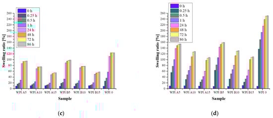 Swelling ability of hydrogels during a 14-day incubation in fluids simulating the biological environment: (a) incubation in artificial saliva; (b) incubation in SBF; (c) incubation in Ringer’s fluid; (d) incubation in distilled water.