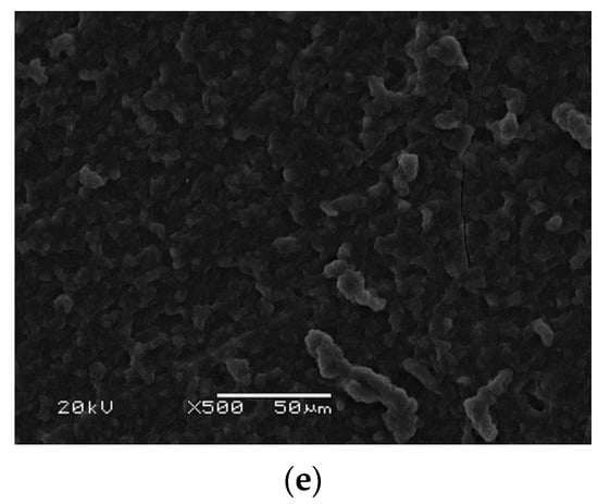 An analogous measurement was carried out for the WPI matrix itself, without ceramic reinforcement. The obtained result is presented in Figure 7e. The lack of apatite crystals on the surface confirms that the WPI protein itself does not promote the formation of apatite layers. Consequently, one would not expect it to demonstrate bioactivity when implanted in bone.