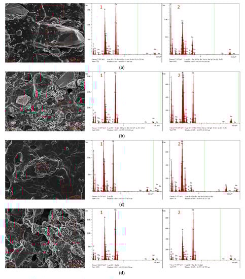 On the surface of the samples incubated in Ringer’s fluid, ceramic crystals can be observed; however, this is probably the hydroxyapatite placed in the hydrogel before the incubation process began. This conclusion is based on the fact that during the incubation period, the biomaterial significantly reduced its volume. This is most likely due to the partial degradation of the protein matrix due to the slightly acidic nature of the fluid. In the case of incubation in distilled water, there are only single points indicating the presence of the ceramic phase. It can therefore be concluded that the formation of new apatite layers depends on both the percentage of the ceramic phase and the incubation environment. Distilled water, in which no Ca and P ions are present, is an environment which interacts poorly with the tested biomaterial. As the content of the selected ions increases, these interactions also increase, as was observed in the case of Ringer’s fluid and the SBF solution.