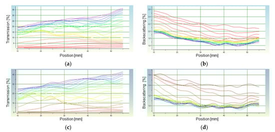 The results of the analysis performed in distilled water are presented in Figure 9a,b (HAp A) and Figure 9c,d (HAp B). In both cases, 20 measurements were taken with an interval of 15 s within 5 min. The transmission value increasing with time indicates a sedimentation process taking place. This increase occurs to the greatest extent at the highest position value; it indicates the gradual clarification of the suspension in the upper part of the measuring vessel. A significant increase in the backscattering at low position values, i.e., at the lower part of the measuring vessel, indicates the accumulation of falling HAp particles. In the case of HAp B, the transmission values are higher than for HAp A. Because the larger the particle diameter, the higher the sedimentation rate, it can be assumed that HAp B is characterized by a larger size of individual particles, which fall faster. In the case of HAp A, the changes in the transmission are also irregular, but the curves in the graph are less wavy than for HAp B. The course of the curves in the graph proves that sedimentation does not occur uniformly in the entire volume. Therefore, it can be concluded that the analyzed suspension is more monodispersive for HAp A than for B.