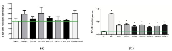 (a) The viability of murine fibroblasts L-929 after 24 h incubation with WPI modified HAp A and HAp B biocomposites, evaluated using the 3-(4,5-dimethylthiazol-2-yl)-2,5-diphenyltetrazolium bromide (MTT) reduction assay according to ISO-10993-5:2009. The cells incubated without composites served as a positive control of the viability (100%). The data are presented as mean ± SD for the three separate experiments. The green line indicates the minimum level (70%) of the cells’ metabolic activity required to recognize the biomaterial as non-cytotoxic at the in vitro level; (b) NF-κB induction in THP1-Blue™ monocytes incubated for 24 h with WPI modified HAp A, and HAp B biocomposites. The cells incubated without composites served as a negative control of the monocyte’s activation (NC), and monocytes stimulated with S. cerevisiae β-glucan served as the positive control (PC). The data are presented as the mean ± SD for the four separate experiments. The green line indicates the physiological level (0.114 ± 0.013) of the non-stimulated monocytes. * p values (<0.05) calculate in comparison to the untreated cell cultures.