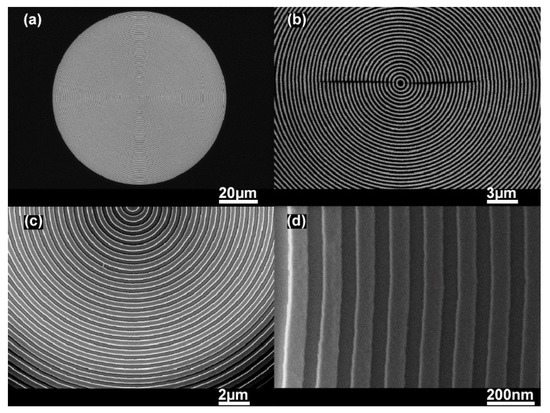 Improved insight into the developed circular grating DFB polymer laser system can be gained by investigating its various properties such as morphology of the circular grating nanostructures, optical microscopic images, optical spectroscopic characterization, and lasing properties. The morphology of the circular grating structure was studied through the scanning electron microscope (SEM) to check the quality of the feedback cavity. The SEM photographs of the circular periodic nanostructures on the glass substrate at various magnification powers are depicted in the Figure 2a–d. As we can observe from the SEM photographs, the circular periodic nanostructures from high to low magnification power are free of defects and have considerable equal spacing between each modulation depth of the circular ring, indicating a significant interest in high-quality laser systems. In our experiment, the period of the circular grating was about 350 nm with respect to the second-order Brag equation used for DFB lasers.