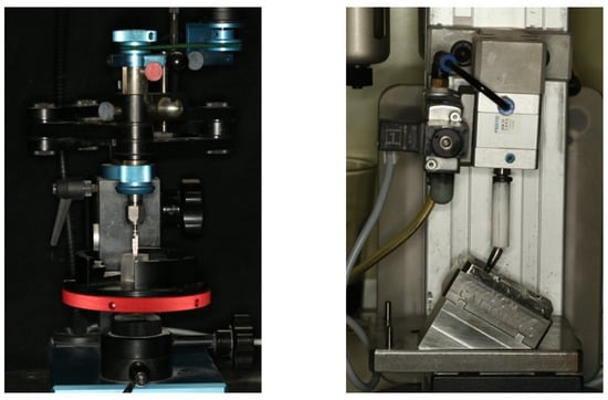 Parallelizing drill press with the implant system drill for the osteotomy preparation (Right); Chewing simulation machine (Instron®, Euroortodoncia S.A. and Complutense University of Madrid), (Left).