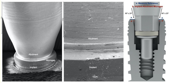 The microgap was defined as angular misfit (difference between the inclined angles of the implant/abutment and the framework cylinder), or the discrepancy/lack of contact measured from the implant platform to the abutment’s corresponding contact area as had been performed in previous gap evaluation studies with internal and conical connection implants (Figure 2) [19,30,31,32]. The microgap was assessed by using a scanning electron microscope (SEM (JSM-6400, JEOL, Tokyo, Japan)) by a microscopy specialist (ICTS National Electron Microscopy Centre; University Complutense of Madrid, Madrid, Spain).