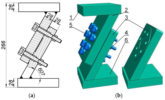 Tested connection: (a) diagram; (b) 3D view (1—upper plate; 2, 3—joined plates; 4—high hexagonal nut; 5—M10×1.25 bolt; 6—base).