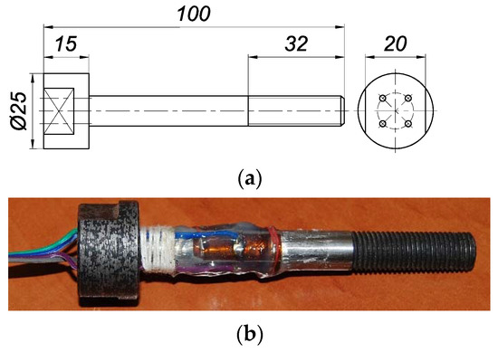 The diagram and view of the single bolt used in the research are shown in Figure 2. Changes in the force in each bolt were measured with four Tenmex TFxy-4/120 strain gauges. Each of them is characterised by the perpendicular arrangement of two axes of measuring ladders. The strain gauges were glued to the outside of the bolt shank in a full Wheatstone bridge configuration.
