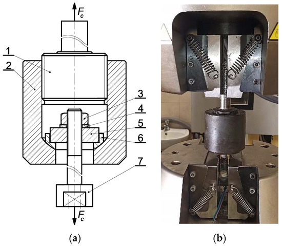 Equipment for calibration of the bolts: (a) diagram (1—special bolt, 2—handle, 3—nut, 4—washer, 5—plate, 6—spherical sleeve, 7—M10 × 1.25 bolt), (b) general view.
