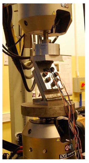 The multi-bolted connection shown in Figure 1 was placed between the upper and lower heads of the Instron 8850 testing machine with the use of additional cylindrical support plates. The constructed main research stand is presented in Figure 4.