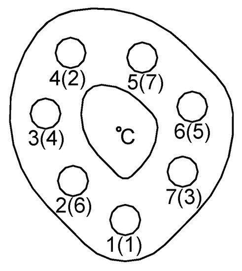 In this study, we examined the multi-bolted connection that is presented in Figure 1. The tested connection consisted of two plates (2) and (3), fastened with seven special bolts with a thread profile of M10 × 1.25 (5) and high hexagonal nuts (4). The joined plates (2 and 3) were welded to the upper plate (1) and to the base (6). All joined elements were composed of steel S355J2 (1.0577). The bolts were fabricated in the 8.8 class of mechanical properties, and the nuts in class 8. To minimise the hysteresis during calibration, the bolts were heat-treated. Washers were not considered in the connection tests. A more detailed description of the multi-bolted connection can be found in [6].