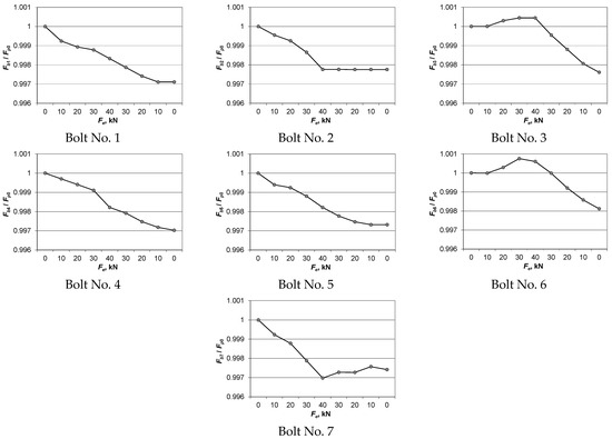 The distributions of the mean values of Fbi in the bolts, referring to the initial force value Fp0 during loading and unloading of the connection, are shown in Figure 7. As a result of the analysis of the charts in Figure 7, the following conclusions were drawn:
