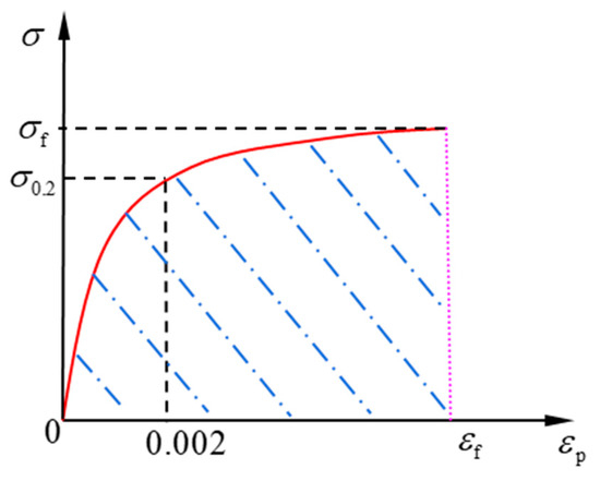 The plastic strain and stress relationship is shown in Figure 2, where the shaded area is the plastic strain energy density that could be calculated by integrating Equation (3) with respect to strain, as shown in Equation (4):