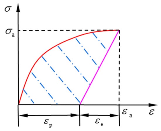 The plastic strain energy density accumulated at the dangerous point within a single cycle under uniaxial cyclic loading is considered. When applying the modified Ramberg–Osgood model, the unloading curve can be formulated by ε = (σ − σa)/E0 + εa, as shown in Figure 3. The shaded area is the plastic strain energy density accumulated within one cycle.