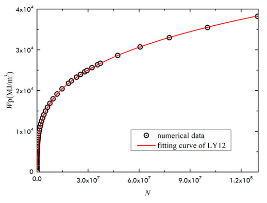 The modified Ramberg–Osgood stress–strain relationship is used in the study. Given the stress ratio of 0, the fitting is conducted from the relationship between fatigue life and accumulative plastic strain energy density for the two materials LY12 and LC9, as shown in Figure 4 and Figure 5. The constants α and b could be numerically fitted. By fitting, α = 106.94 and b + 1 = 0.2927 could be obtained for LY12 material, and α = 200.42, b + 1 = 0.2147 for LC9 material.