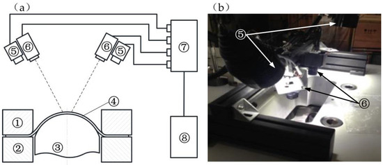 Structure of the digital image measurement part. (a) Schematic diagram; (b) physical picture. Components labeled in the figure are as follows: ① die; ② blank holder; ③ punch; ④ specimen; ⑤ LED light source; ⑥ camera; ⑦ controller; ⑧ computer.