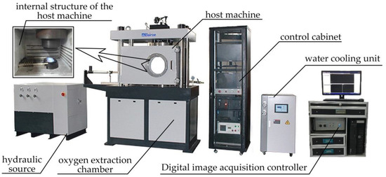 As shown in Figure 2, the structure of the host machine consisted of a closed environmental cabinet, punch, die, blank holder, heating coil for the internal environment of the cabinet, rapid heating coil for the specimen, electric drive pusher, guide rail, etc. Of these, the die adopted an open structure. The image observation hole at the upper position of the closed environmental cabinet was installed with a temperature-resistant quartz glass with a thickness of 8 mm for the purpose of thermal insulation and transparency, which would facilitate the image collection of the camera in the upper positions in the forming process of the sheet material.