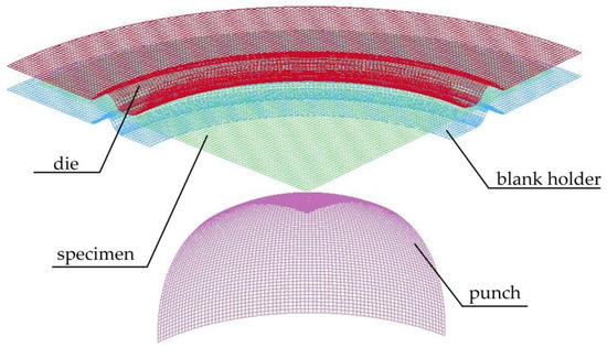 The finite element model is shown in Figure 6. Since the sheet material was in a symmetrical shape, a 1/4 model was adopted for the simulation. The motion parameters of the various components were consistent with those in the experiment, which meant that the blank holder would first move upward through the stroke control, and then clamp the sheet material together with the die. The blank holder was then switched to the control of the constant blank holder force, and the punch started moving upward through the stroke control. Different from the control method of equipment, in the DYNAFORM software (v5.7, Engineering Technology Associates, Inc., Detroit, MI, USA), it was impossible to set the experiment to automatically stop when the forming force dropped by 5%. In order to achieve the numerical simulation process of full deformation and fracture of the sheet, the punch was controlled by stroke of the sheet metal cracked in the experiment plus 10 mm. The fracture criterion is included in the material model of 36*MAT_3-PARAMETER_BARLAT of DYNAFORM software. The fracture criterion is used to calculate the limit strain by calculating thickness t and hardening exponent n in the material model.