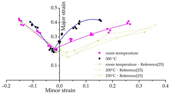 Forming limit curve diagram of DP600 steel at room temperature and 300 °C in this paper. The line is fitted to obtain the average of the measurement results for three samples of each width. The results from the literature [25] are also shown.