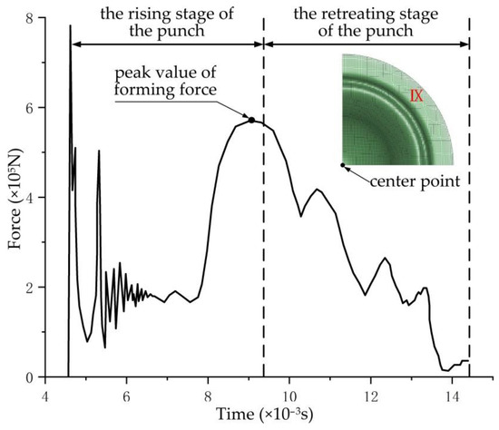 After the completion of the forming simulation of DP600 steel at 300 °C and at room temperature, taking the specimen IX at 300 °C as an example, the curve for the contact force of the center point between the punch and sheet was extracted at the time of the maximum force of the punch with the judgment method [19] as shown in Figure 9. When the punch was in contact with the sheet material, the forming force (Y value) reached the peak value. In the subsequent process of stabilized forming, the forming force would reach the peak value again. As the forming continued, the grids in the most severe forming area would encounter distortion due to excessive stretching, leading to a gradual decline in the contact force between the punch and the sheet material. The time when the contact force declined to 5% of the peak was selected as the time for the calculation of the limit strain.