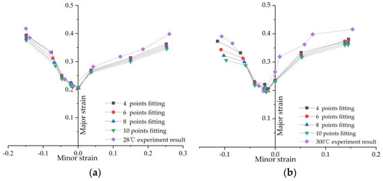 Comparison between the calculation results of the forming limit curve for different numbers of fitting points and the experimental results at room temperature 28 °C (a) and at 300 °C (b).