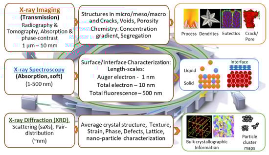 However, the challenges associated with the real-time imaging of metallic systems often involve heating to extremely high temperatures, sensitivity to the surrounding atmosphere (pressure and reactive conditions), and more importantly, devising ways to look through a 3D specimen. To date, the bulk of the studies that reported material microstructures are based on post-mortem analyses [7,8]. However, with the establishment of synchrotron radiation facilities worldwide having high-flux and stable X-rays (1–105 keV), many unprecedented scientific findings have been made possible over the last two decades [7,9,10,11,12,13]. The static 3D internal information of a specimen is now routinely obtained using synchrotron or laboratory tomography. However, capturing dynamically evolving changes (in seconds to milliseconds) with millimeter to sub-micrometer resolution requires specialised experimental equipment, often only available at a handful of synchrotrons in the world [14]. Furthermore, it is now also possible to obtain crystallographic and chemical information of metallic specimens at the nanometre resolution using a diverse set of X-ray based synchrotron characterisation methods including: diffraction to obtain bulk atomic measurements, phases, crystal defects and strains [13], and spectroscopy to probe chemical constituents and interfacial structures [15]. Figure 1 shows an overview of different synchrotron techniques used for probing information on metallic systems.