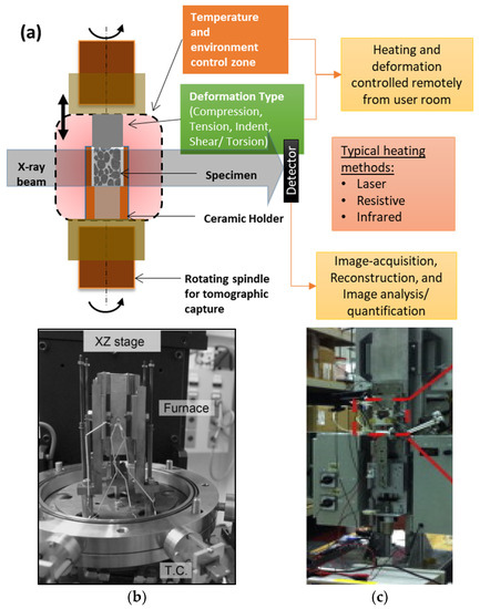 Figure 2 shows a schematic of a typical experimental environment of an ISO cell. Given that each ISO cell has different processing capabilities, they will be selected to match the cooling rates and thermal gradient of the solidfication process. Common heating techniques use lasers, infra-red lamps, and resistive/RF heating units to induce heating and melting of metallic samples (see examples in [40,57,58] and later sections). Laser-based sources provide direct, localised heating on the surface of the crucible holding the sample, and enable fast heating (up to 100 °C/min) and cooling rates (e.g., [25,58]). A number of studies have predominantly used resistive [59] and infrared [37] heating chambers enclosed around the specimen (as shown in the schematic of Figure 2). Resistive furnaces are relatively inexpensive, but heating rates are limited to a few degrees (°C) per second, while infrared furnaces can achieve faster heating rates (on small samples) but are less stable and expensive. Similarly, mechanical rigs are needed to perform various modes of deformation such as tension, compression, and torsion/shear, or a combination of these (e.g., [37,60,61,62] and Figure 2b). Several studies have reported integrated electromagnetic, and ultrasound heating and mixing systems (e.g., [63] and Figure 2c). The choice of deformation speed is often limited by the beamline’s imaging hardware. Currently, these ISO mechanical stages can perform deformation at strain rates typically up to 100 µm/s for tomographic capture [64,65].