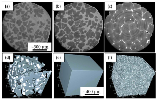 In situ tomographic capture solidifying microstructures: (a–c) Reconstructed slices of tomographic scans captured during solidification of Al-4wt%Cu alloy, showing microstructure evolution in real-time. The light grey shows liquid and the dark phase represents solidifying microstructures, after Salvo et al., [101] (Reproduced from Salvo et al., 3D imaging in material science: Application of X-ray tomography. Comptes Rendus Phys. 2010, 11, 641–649. Copyright© 2021, Elsevier Masson SAS, All rights reserved); (d–f) 3D reconstructed views of melting and solidification sequence of Al-20 wt.% Cu alloy performed using a laser-based furnace (after Fife et al., [21]). Permitted for reuse from respective publishers.