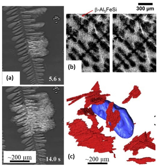 In recent years, there have been several key observations of microstructural evolution that have helped develop detailed geometrical [102] as well as a physical understanding of dendritic [103] and eutectic [31,104] growth morphologies. Matheissen and co-workers investigated the nucleation and growth of Sr-modified irregular eutectic microstructures in Al-Si-Cu-Sr alloys [31] (Figure 6a). The radiographic observations helped reveal the mechanisms by which intermetallics and eutectics nucleate and grow between primary dendrites. Puncreobutr et al. [33], investigated the nucleation and growth and of Fe-intermetallics in Al alloys using fast tomography (Figure 6b,c). The authors were able to resolve 10 μm thick intermetallic features, and investigate their role in altering the mushy zone permeability and the associated hot-cracking during solidification, producing an enhanced model of permeability.