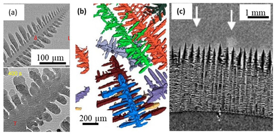 Maire et al. [40] demonstrated several examples of high-resolution X-ray synchrotron tomography for metallic systems, which led to a large number of studies on microstructure evolution during solidification. The authors showcased ESRF-ID19′s capabilities as a microtomography beamline for capturing microstructural growth in Al alloys. Spatial and temporal resolutions of about 1 µm and 0.3 s were achieved in performing high-resolution tomographic scans within an hour (Figure 5a). Matheisen and co-workers reported many new and interesting phenomena by using radiographic observations of solidification of a range of Al-Cu alloys, specifically capturing dendrite fragmentation, overgrowth, interdendritic porosity, and liquid-phase separation in monotectic reaction [53,96,98]. Similar directional solidification experiments were reported by Yasuda and co-workers in Sn-Bi alloys [99,100], and Nguyen Thi and co-workers also published a number of solidification mechanisms in Al alloys [24].