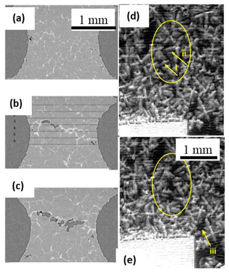 (a–c) 3D reconstructed slices showing the evolution of a hot-tear during tensile deformation of a semi-solid Al-Cu alloy specimen (after Terzi et al. [117]). (d,e) In situ radiographic observations showing direct evidence for Reynolds’ dilatancy in an equiaxed dendritic mush. In the circled region, an initially compacted crystal assembly dilates during deformation under a compressive load (after Gourlay et al. [119]) Permitted for reuse from respective publishers.