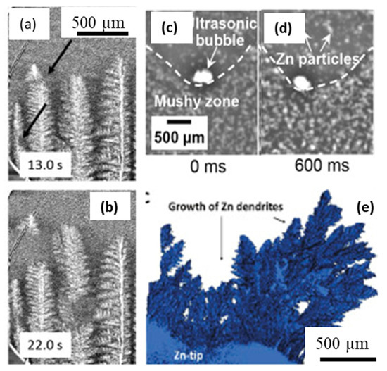 Solidification experiments in the presence of external forcing via electromagnetic and ultrasonic forcing, and electrochemical reactions: (a,b) solidification sequence of an Al–15 wt.% Cu alloy solidified with an electromagnetic field. Thermal gradient G = 48 K·mm−1, peak current I = ±300 mA, pulse frequency 1 Hz, sine-wave form, magnetic field B = 0.1 T, and peak Lorentz force acting on the sample = ±0.3 mN (after Liotti et al., [63]). (c,d) A sequence of X-ray images, showing the cyclic impact and pounding of the oscillating bubble at the L-S interface in the Bi-8% Zn alloy during ultrasonic cavitation, (after [139] (e) Reconstructed 3D cross-sectional image of the dendrites in zinc anode attached to the tip, (after Yufit et al., [140]). Permitted for reuse from respective publishers.