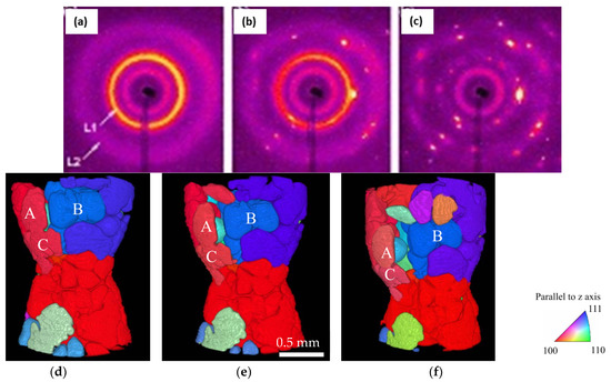 (a–c) X-ray diffraction patterns of the aluminium alloy with titanium solute (0.1 wt.%) and added TiB2 particles (0.1 wt.%) at different stages (a–c) of the solidification process (after Iqbal et al. [147]). Collected during cooling from 973 K at a rate of 1 K/min; (d–f) show the crystallographic orientation of the 3D-reconstructed solid grains in the equiaxed Al–10 mass% Cu alloy at the strains of (d) −0.04, (e) −0.06, and (f) −0.13; where the color variation indicates the crystallographic orientation as detected by 3DXRD, after Narumi et al. [146]. Permitted for reuse from respective publishers.