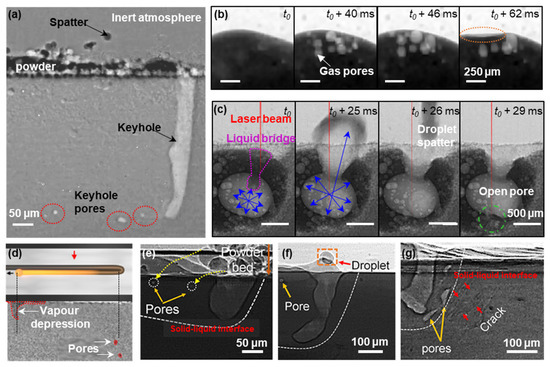 Besides the keyhole pore formation, there are many different types of porosity exhibited in LAM components, including gas pores, open-pores, lack of fusion, inter/intralayer pores, etc., and several research teams investigated their underlying formation mechanism, see examples in Figure 11. Leung et al. revealed the melt pool and melt track dynamics inside single-layer tracks (with a track length of 5 mm) and subsequent build layer during LPBF of Fe-based alloys (Invar 36 with [152]/without powder oxidation [58] and SS316L [26]) under overhang conditions. They uncovered a series of pore evolution mechanisms during LPBF, including pore formation due to the keyhole mode operation, a reduction of gas solubility in the molten pool (Figure 11b), pore migration via the recirculating Marangoni-driven flow, open-pore formation by pore bursting (Figure 11c), pore dissolution and dispersion by laser re-melting in subsequent build layer [58]. They also showed that pores can also be formed via vaporisation of low boiling point elements i.e., the reboil effect [26] and heterogeneously nucleate from the metal oxides’ surface inside the melt pool [152], and pore growth via coalescence of smaller pores. Aiden et al. [154] reported that pores can also be formed during laser turning due to the collapse of a keyhole depression or caused by abnormal heat input to the powder bed due to the acceleration/deceleration of scanning mirrors (Figure 11d). Hojjatzadeh et al. [25] captured three other pore evolution mechanisms, including (1) pore transfer from powder feedstock to the molten pool, pore trapped by (2) fluctuations of the melt surface or at the depression zone (Figure 11e,f), or (3) pore formation from a crack (Figure 11g).
