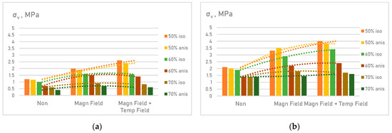 The samples were divided into two groups, equal in the number of samples. One group in the process of polymerization was exposed to an external magnetic field of 1.2 T for 12 h. This resulted in samples with distinct structure anisotropy along the magnetic field lines direction (Figure 2c,d). The second group of samples was not subjected to further exposure in course of curing process and exhibited an isotropic structure [24,25,26,27].