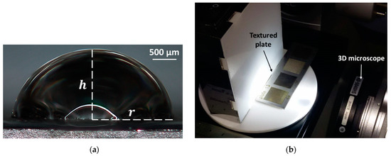 (a) Definition of the height () and radius () of the droplet for the evaluation of the contact angle through Equation (1); (b) Setup for the measurement of the contact angle by using a 3D microscope.