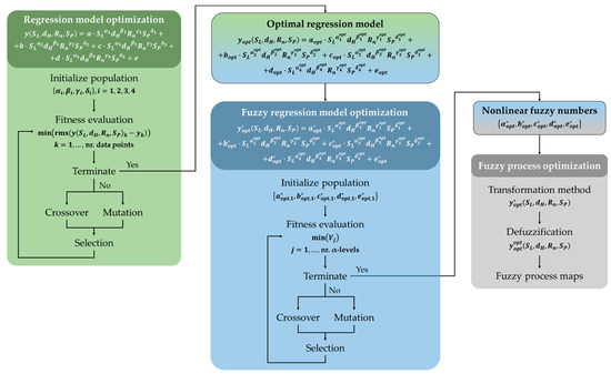 The proposed approach consists of the development of a fuzzy regression model starting from the regression model previously optimized through the application of the genetic algorithm, described by Equation (2):