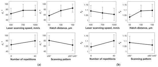 Experimental results in terms of (a) contact angle () and (b) developed surface area ratio () about how they are affected by the operational process parameters varied in this investigation, i.e., laser scanning speed, hatch distance, number of repetitions, and scanning pattern (see Table 4 and Table 5). The black dots represent the mean values of the response variables, while the error bars represent the standard deviations.