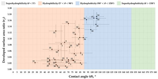 Wettability states observed during the experimental campaign. The numbers refer to the operational combinations of investigated parameters (see Table 4). The majority of the results are within the range of the hydrophilic state (5° < < 90°), while only six scenarios fall in the hydrophobic range (90° < < 150°), i.e., 14 to 18 and 35. For the details of the parameters’ values, please refer to Table 5.